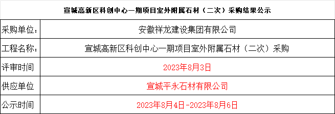 宣城高新區(qū)科創(chuàng)中心一期項目室外附屬石材(二次)采購結(jié)果公示