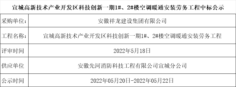 宣城高新技術(shù)產(chǎn)業(yè)開發(fā)區(qū)科技創(chuàng)新一期1#、2#樓空調(diào)暖通安裝勞務(wù)工程中標(biāo)公示