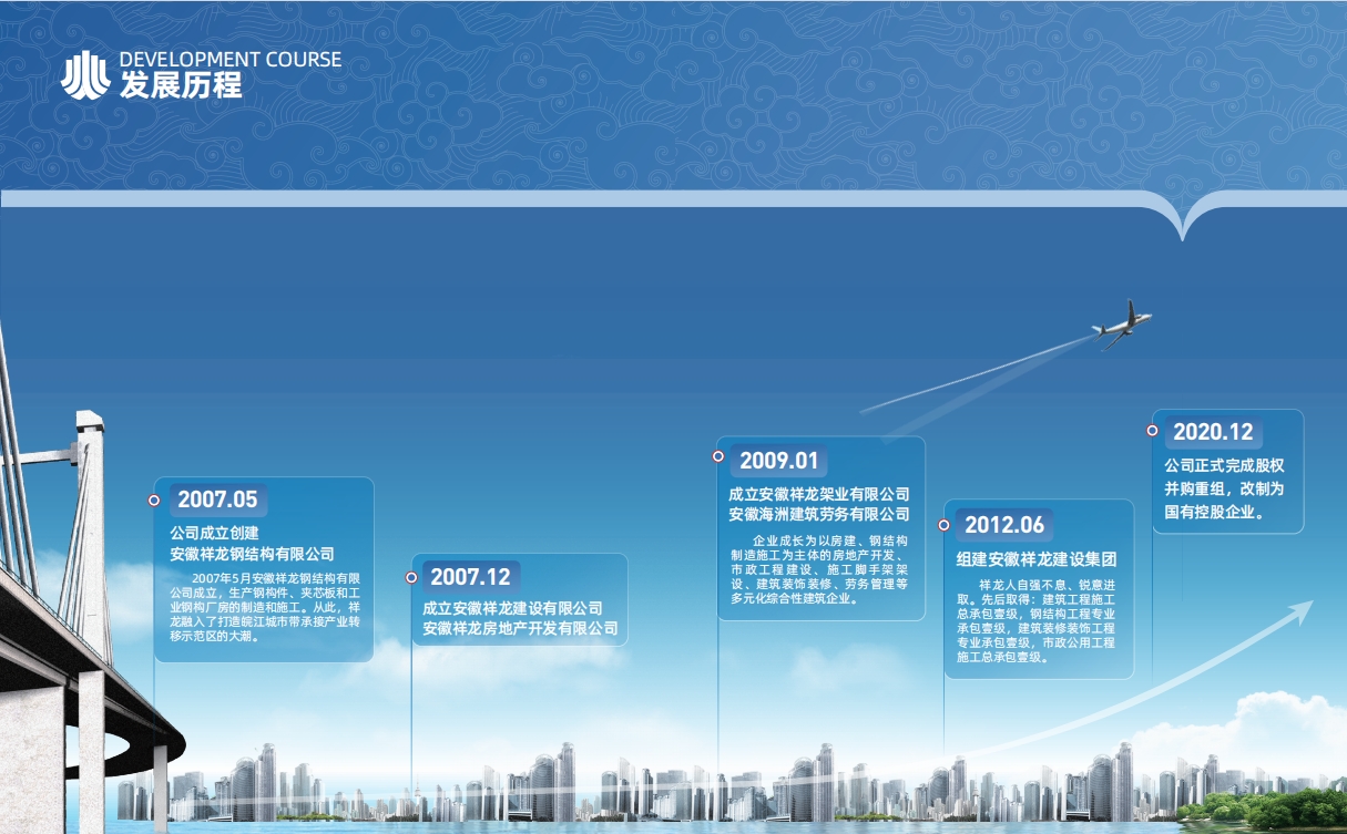 安徽祥龍建設集團有限公司成立于2005年,企業注冊資本金1.46億元,擁有建筑工程施工總承包、市政公用工程施工總承包建筑裝修裝飾工程專業承包、鋼結構工程專業承包(全資子公司安徽祥龍鋼結構有限公司)等四項國家壹級資質2020年12月公司正式完成股權并購重組,改制為國有控股企業。